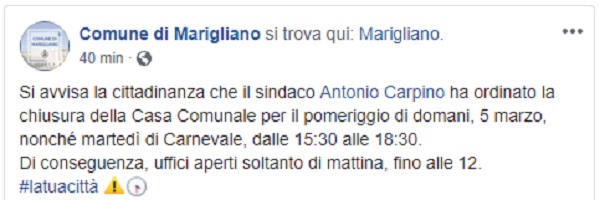 Questo il post pubblicato sulla pagina fb ufficiale del Comune di Marigliano.