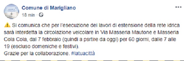 Questo il post pubblicato sulla pagina fb ufficiale del Comune di Marigliano.