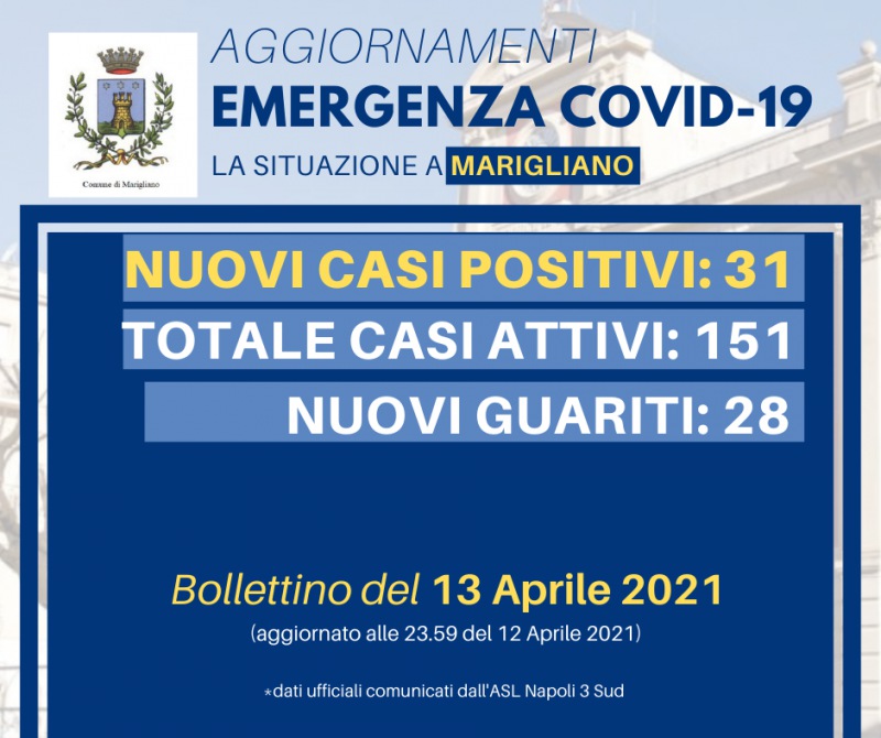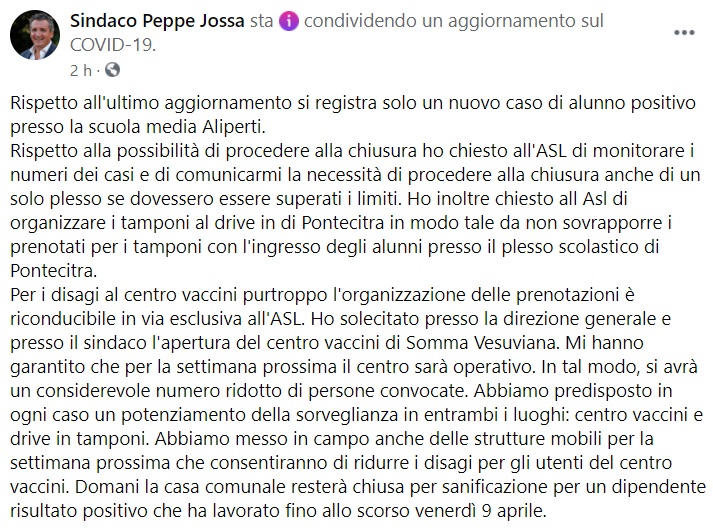 Questo quanto pubblicato sulla pagina fb del Sindaco di Marigliano: "Rispetto all'ultimo aggiornamento si registra solo un nuovo caso di alunno positivo presso la scuola media Aliperti. Rispetto alla possibilità di procedere alla chiusura - si legge nella nota - ho chiesto all'ASL di monitorare i numeri dei casi e di comunicarmi la necessità di procedere alla chiusura anche di un solo plesso se dovessero essere superati i limiti. Ho inoltre chiesto all'Asl di organizzare i tamponi al drive in di Pontecitra in modo tale da non sovrapporre i prenotati per i tamponi con l'ingresso degli alunni presso il plesso scolastico di Pontecitra. Per i disagi al centro vaccini purtroppo l'organizzazione delle prenotazioni è riconducibile in via esclusiva all'ASL - si legge nella nota -. Ho solecitato presso la direzione generale e presso il sindaco l'apertura del centro vaccini di Somma Vesuviana. Mi hanno garantito che per la settimana prossima il centro sarà operativo. In tal modo, si avrà un considerevole numero ridotto di persone convocate. Abbiamo predisposto in ogni caso un potenziamento della sorveglianza in entrambi i luoghi: centro vaccini e drive in tamponi. Abbiamo messo in campo anche delle strutture mobili per la settimana prossima che consentiranno di ridurre i disagi per gli utenti del centro vaccini. Domani la casa comunale resterà chiusa per sanificazione - si legge nella nota - per un dipendente risultato positivo che ha lavorato fino allo scorso venerdì 9 aprile."