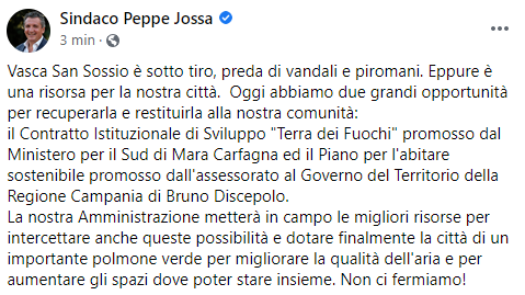 Questo il post pubblicato sulla sua pagina Facebook dal Sindaco di Marigliano Peppe Jossa: "Vasca San Sossio è sotto tiro, preda di vandali e piromani. Eppure è una risorsa per la nostra città. Oggi abbiamo due grandi opportunità per recuperarla e restituirla alla nostra comunità: il Contratto Istituzionale di Sviluppo "Terra dei Fuochi" - si legge nel post - promosso dal Ministero per il Sud di Mara Carfagna ed il Piano per l'abitare sostenibile promosso dall'assessorato al Governo del Territorio della Regione Campania di Bruno Discepolo. La nostra Amministrazione - prosegue il post - metterà in campo le migliori risorse per intercettare anche queste possibilità e dotare finalmente la città di un importante polmone verde per migliorare la qualità dell'aria e per aumentare gli spazi dove poter stare insieme. Non ci fermiamo!".