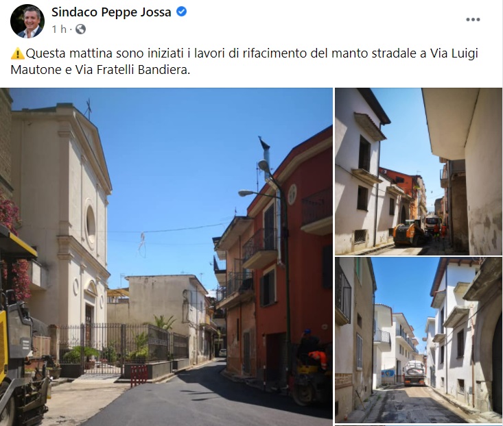 Questo quanto apprendiamo dalla pagina fb del Sindaco Jossa: "Questa mattina sono iniziati i lavori di rifacimento del manto stradale a Via Luigi Mautone e Via Fratelli Bandiera."