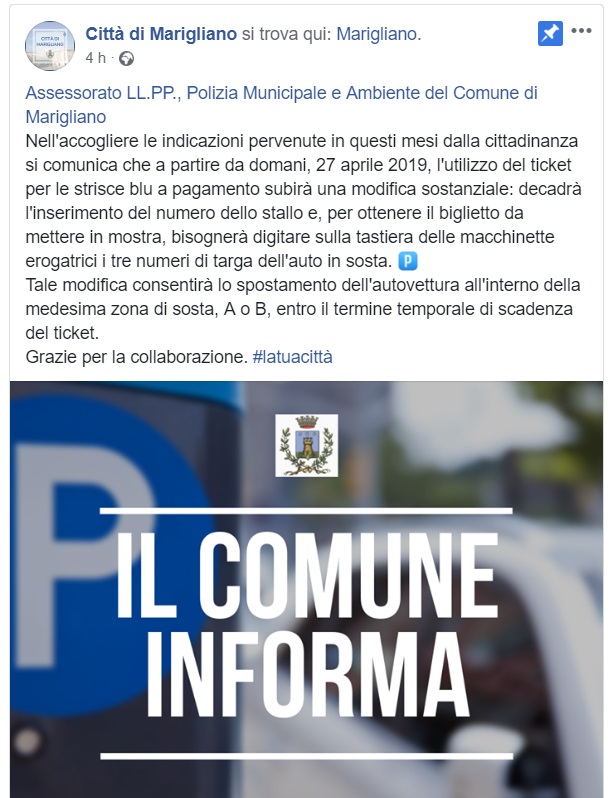 Questo quanto comunicato sulla pagina FB del Comune di Marigliano