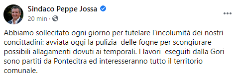 Questo il post pubblicato sulla sua pagina Facebook dal Sindaco di Marigliano Giuseppe Jossa: "Abbiamo sollecitato ogni giorno per tutelare l’incolumità dei nostri concittadini: avviata - si legge nel post - oggi la pulizia delle fogne per scongiurare possibili allagamenti dovuti ai temporali. I lavori eseguiti dalla Gori sono partiti da Pontecitra ed interesseranno tutto il territorio comunale".