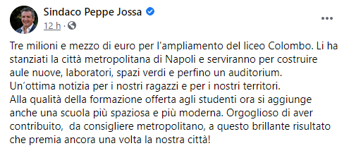 Questo il post pubblicato sulla sua pagina Facebook dal Sindaco di Marigliano Peppe Jossa: "Tre milioni e mezzo di euro per l'ampliamento del liceo Colombo. Li ha stanziati la città metropolitana di Napoli e serviranno per costruire aule nuove, laboratori, spazi verdi e perfino un auditorium. Un’ottima notizia - si legge nel post - per i nostri ragazzi e per i nostri territori. Alla qualità della formazione offerta agli studenti ora si aggiunge anche una scuola più spaziosa e più moderna. Orgoglioso - conclude il post - di aver contribuito, da consigliere metropolitano, a questo brillante risultato che premia ancora una volta la nostra città".