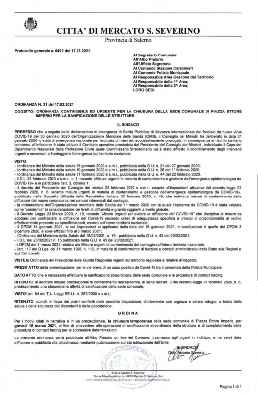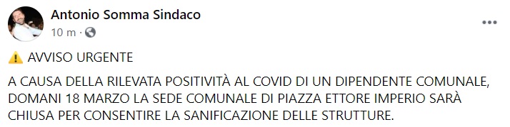 "AVVISO URGENTE. A CAUSA DELLA RILEVATA POSITIVITÀ AL COVID DI UN DIPENDENTE COMUNALE, DOMANI 18 MARZO LA SEDE COMUNALE DI PIAZZA ETTORE IMPERIO SARÀ CHIUSA PER CONSENTIRE LA SANIFICAZIONE DELLE STRUTTURE."