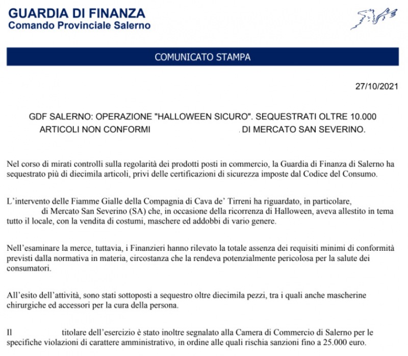 Nel corso di mirati controlli sulla regolarità dei prodotti posti in commercio, la Guardia di Finanza di Salerno ha sequestrato più di diecimila articoli, privi delle certificazioni di sicurezza imposte dal Codice del Consumo. L’intervento delle Fiamme Gialle della Compagnia di Cava de’ Tirreni - si legge nella nota - ha riguardato, in particolare, ... di Mercato San Severino (SA) che, in occasione della ricorrenza di Halloween, aveva allestito in tema tutto il locale, con la vendita di costumi, maschere ed addobbi di vario genere. Nell’esaminare la merce, tuttavia, i Finanzieri hanno rilevato la totale assenza dei requisiti minimi di conformità previsti dalla normativa in materia, circostanza che la rendeva potenzialmente pericolosa per la salute dei consumatori. All’esito dell’attività, sono stati sottoposti a sequestro oltre diecimila pezzi, tra i quali anche mascherine chirurgiche ed accessori per la cura della persona. Il ... titolare dell’esercizio è stato inoltre segnalato alla Camera di Commercio di Salerno - si legge nella nota - per le specifiche violazioni di carattere amministrativo, in ordine alle quali rischia sanzioni fino a 25.000 euro."