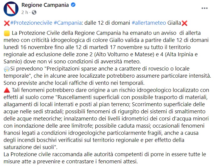 Questo quanto apprendiamo dalla pagina facebook della Regione Campania: