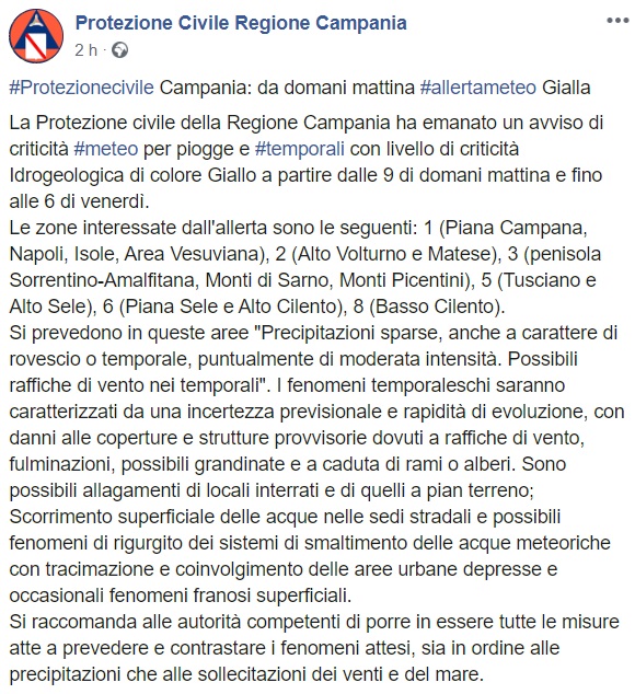 Questa quanto appreso dalla pagina Facebook della Protezione Civile Regione Campania: