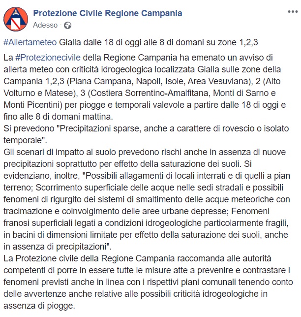 Questa la nota apparsa sulla pagina Facebook della Protezione Civile Regione Campania: