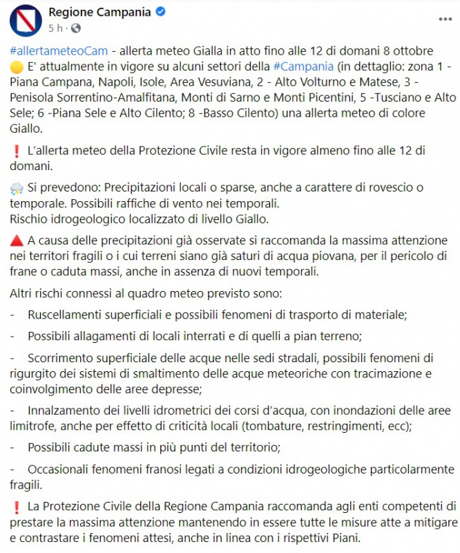 "#allertameteoCam - allerta meteo Gialla in atto fino alle 12 di domani 8 ottobre. E' attualmente in vigore su alcuni settori della #Campania (in dettaglio: zona 1 - Piana Campana, Napoli, Isole, Area Vesuviana, 2 - Alto Volturno e Matese, 3 - Penisola Sorrentino-Amalfitana, Monti di Sarno e Monti Picentini, 5 -Tusciano e Alto Sele; 6 -Piana Sele e Alto Cilento; 8 -Basso Cilento) una allerta meteo di colore Giallo. L’allerta meteo della Protezione Civile resta- si legge nella nota- in vigore almeno fino alle 12 di domani. Si prevedono: Precipitazioni locali o sparse, anche a carattere di rovescio o temporale. Possibili raffiche di vento nei temporali. Rischio idrogeologico localizzato di livello Giallo. A causa delle precipitazioni già osservate si raccomanda la massima attenzione nei territori fragili o i cui terreni siano già saturi di acqua piovana, per il pericolo di frane o caduta massi, anche in assenza di nuovi temporali.%u200B Altri rischi connessi al quadro meteo previsto sono: - Ruscellamenti superficiali e possibili fenomeni di trasporto di materiale; - Possibili allagamenti di locali interrati e di quelli a pian terreno; - Scorrimento superficiale delle acque nelle sedi stradali, possibili fenomeni di rigurgito dei sistemi di smaltimento delle acque meteoriche con tracimazione e coinvolgimento delle aree depresse; - Innalzamento dei livelli idrometrici dei corsi d’acqua, con inondazioni delle aree limitrofe, anche per effetto di criticità locali (tombature, restringimenti, ecc); - Possibili cadute massi in più punti del territorio; - Occasionali fenomeni franosi legati a condizioni idrogeologiche particolarmente fragili.%u200B La Protezione Civile della Regione Campania raccomanda- si legge nella nota- agli enti competenti di prestare la massima attenzione mantenendo in essere tutte le misure atte a mitigare e contrastare i fenomeni attesi, anche in linea con i rispettivi Piani."