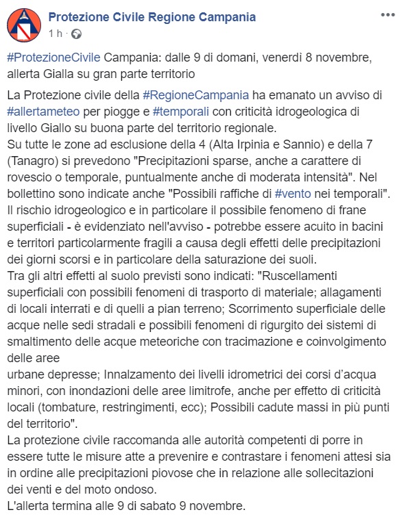 Questo quanto apparso sulla pagina Facebook della Protezione Civile Regione Campania: