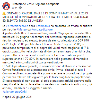 Questo il post pubblicato sulla pagina Facebook 'Protezione Civile Regione Campania': "ONDATE DI CALORE, DALLE 8 DI DOMANI MATTINA ALLE 20 DI MERCOLEDÌ TEMPERATURE AL DI SOPRA DELLE MEDIE STAGIONALI ED ELEVATO TASSO DI UMIDITÀ. La Protezione Civile della Campania ha emanato un avviso di criticità per rischio Meteo da ondate di calore. A partire dalle 8 di domani mattina - si legge nel post - lunedì 28 giugno e fino alle 20 di mercoledì 30 giugno nei comuni dell territorio regionale classificati a rischio moderato ed elevato (come da elenco allegato alla DGR 870 dell'8 luglio 2005 pubblicata sul Burc n. 37 del 1 agosto 2005) si prevedono - prosegue il post - temperature al di sopra dei valori medi stagionali di 7-8 gradi, soprattutto nella giornata di domani e un tasso di umidità che, soprattutto nelle ore serali e notturne sul settore costiero, potrà superare anche il 70-80%, in particolare nelle giornate di martedì e mercoledì e in condizioni di scarsa ventilazione. La Sala Operativa regionale - si legge ancora - in considerazione dell'avviso emesso dal Centro Funzionale della protezione civile, invita i sindaci di tutti i Comuni e gli enti competenti a porre in essere le procedure di propria pertinenza relative alla vigilanza per le fasce fragili della popolazione. Si raccomanda - prosegue ancora il post - di non esporsi al sole o praticare attività sportive nelle ore più calde. Particolare attenzione devono prestare i cardiopatici, gli anziani, i bambini e i soggetti a rischio".