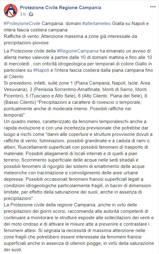 Questa quanto pubblicato sulla pagina facebook della Protezione Civile della Regione Campnaia: