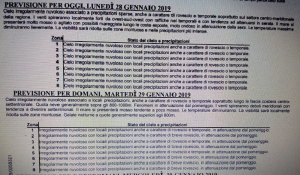 "Fino alle ore 23.59 di oggi 28 gennaio 2019: Livello di criticità: Ordinaria per rischio idrogeologico localizzato su tutte le zone di allerta. Codice colore: Giallo su tutte le zone di allerta. A partire dalle ore 00:00 e fino alle ore 12:00 del 29.01.2019 Rischio idraulico e idrogeologico per gli aspetti di protezione civile: Livello di criticità: Ordinaria per rischio idrogeologico localizzato sulle zone di allerta 1,3 e 5 Fenomeni poco significativi prevedibili sul territorio per le zone 2,4,6,7 e 8 Livello di allerta: Codice colore: Giallo sulle zone 1,3 e 5 Verde sulle zone 2,4,6,7 e 8"