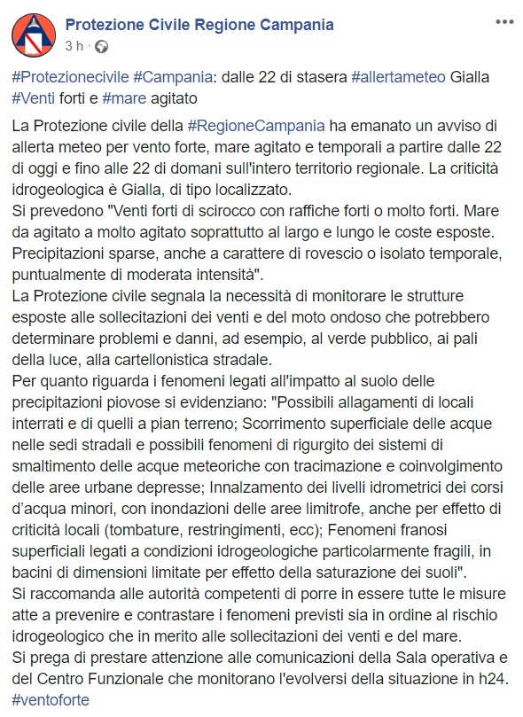 Questo quanto pubblicato sulla pagina facebook della Protezione Civile della Regione Campania: