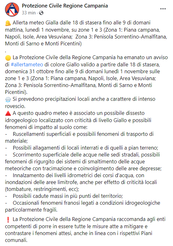 Questo il post pubblicato sulla pagina Facebook della Protezione Civile Regione Campania: "Allerta meteo Gialla dalle 18 di stasera fino alle 9 di domani mattina, lunedì 1 novembre, su zone 1 e 3 (Zona 1: Piana campana, Napoli, Isole, Area Vesuviana; Zona 3: Penisola Sorrentino-Amalfitana, Monti di Sarno e Monti Picentini). La Protezione Civile della Regione Campania - si legge nel post - ha emanato un avviso di allerta meteo di colore Giallo valido a partire dalle 18 di stasera, domenica 31 ottobre fino alle 9 di domani lunedì 1 novembre sulle zone 1 e 3 (Zona 1: Piana campana, Napoli, Isole, Area Vesuviana; Zona 3: Penisola Sorrentino-Amalfitana, Monti di Sarno e Monti Picentini). Si prevedono - recita il post - precipitazioni locali anche a carattere di intenso rovescio. A questo quadro meteo è associato un possibile dissesto idrogeologico localizzato con criticità di livello Giallo e possibili fenomeni di impatto al suolo come: - Ruscellamenti superficiali e possibili fenomeni di trasporto di materiale; - Possibili allagamenti di locali interrati e di quelli a pian terreno; - Scorrimento superficiale delle acque nelle sedi stradali, possibili fenomeni di rigurgito dei sistemi di smaltimento delle acque meteoriche con tracimazione e coinvolgimento delle aree depresse; - Innalzamento - si legge - dei livelli idrometrici dei corsi d’acqua, con inondazioni delle aree limitrofe, anche per effetto di criticità locali (tombature, restringimenti, ecc); - Possibili cadute massi in più punti del territorio; - Occasionali fenomeni franosi legati a condizioni idrogeologiche particolarmente fragili.%u200B La Protezione Civile della Regione Campania raccomanda agli enti competenti di porre in essere tutte le misure atte a mitigare e contrastare i fenomeni attesi, anche in linea con i rispettivi Piani comunali".