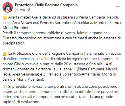 Questo parte del post pubblicato sulla pagina Facebook 'Protezione Civile Regione Campania': "Allerta meteo Gialla dalle 20 di stasera su Piana Campana, Napoli, Isole, Area Vesuviana, Penisola Sorrentino-Amalfitana, Monti di Sarno - si legge nel post - e Monti Picentini Possibili temporali intensi, raffiche di vento, fulmini e grandine. Dissesto idrogeologico: attenzione a caduta massi anche in assenza di precipitazioni. La Protezione Civile della Regione Campania ha emanato un avviso di allerta meteo con livello di criticità idrogeologica per temporali di colore Giallo valevole a partire dalle 20 di stasera e fino alle 14 di domani - prosegue il post - domenica 3 ottobre, sulle zone: 1 (Piana Campana, Napoli, Isole, Area Vesuviana) e 3 (Penisola Sorrentino-Amalfitana, Monti di Sarno e Monti Picentini). Si prevedono rovesci e temporali che, in alcune zone potrebbero essere anche intensi. I fenomeni in atto sono difficilmente prevedibili in termini spaziali e temporali - conclude il post - poiché caratterizzati da una grande rapidità di evoluzione (...).