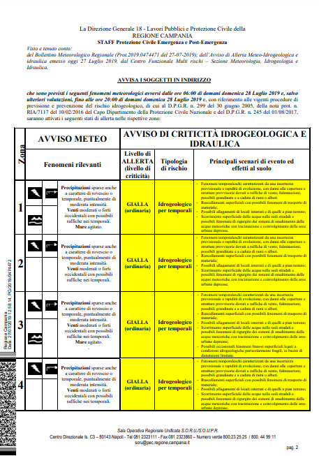 Allerta METEO GIALLA DOMANI, DOMENICA 28 LUGLIO 2019 su 6 zone su 8 della Regione Campania. Allerta prevista dalle ore 6 alle 20 di domani
