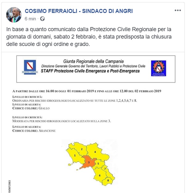 A causa dell'allerta meteo che interesserà tutta la Regione Campania, il Sindaco di Angri Cosimo Ferraioli ha predisposto la chiusura delle scuole.