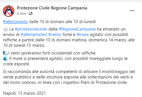 La Protezione Civile della Regione Campania ha emanato un avviso di allerta meteo vento forte e mare agitato con possibili raffiche a partire dalle 10 di domani mattina, domenica 14 marzo, alle 10 di lunedì 15 marzo. I venti - si legge nel post - spireranno forti occidentali con raffiche. Il mare si presenterà agitato, con possibili mareggiate lungo le coste esposte. Si raccomanda alle autorità competenti - prosegue il post - di attivare il monitoraggio del verde pubblico e delle strutture esposte alle sollecitazioni dei venti e del moto ondoso, in linea con i rispettivi Piani di Protezione civile".