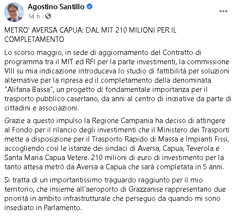 Lo apprendiamo dalla pagina Facebook del Senatore Agostino Santillo.