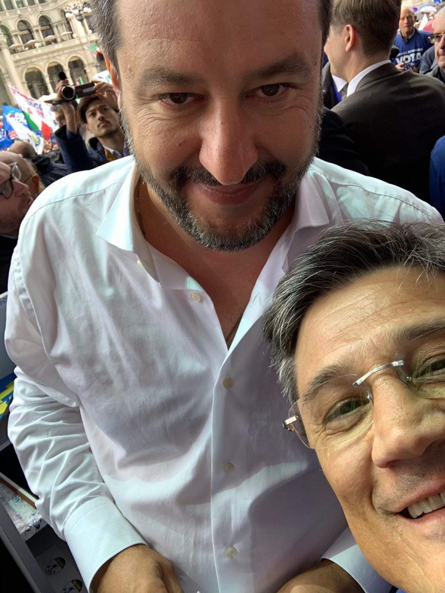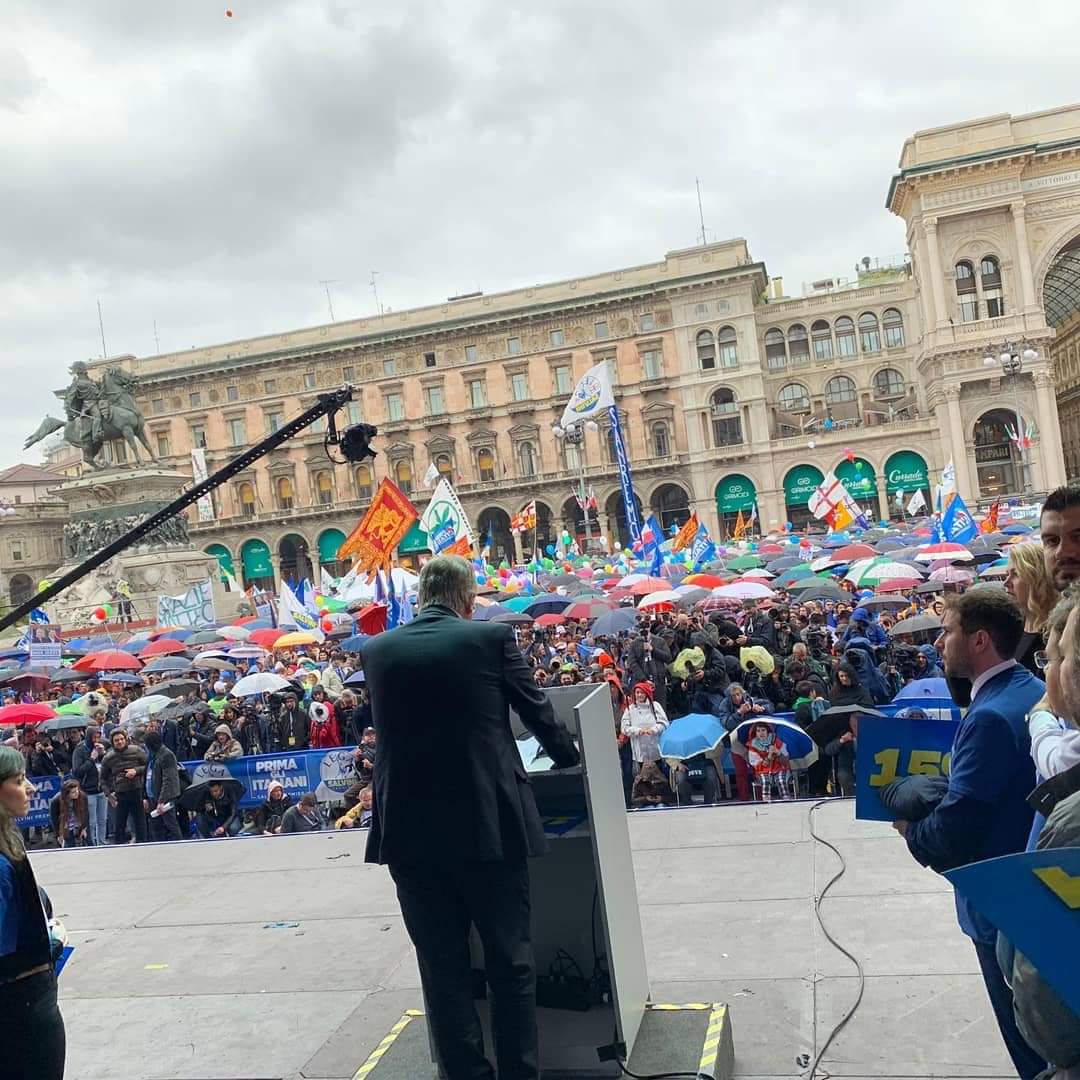 "Sul palco di piazza Duomo si stanno alternando i leader europei. Aspettiamo l'intervento di Marine Le Pen e del capitano Matteo Salvini @matteosalviniofficial !"