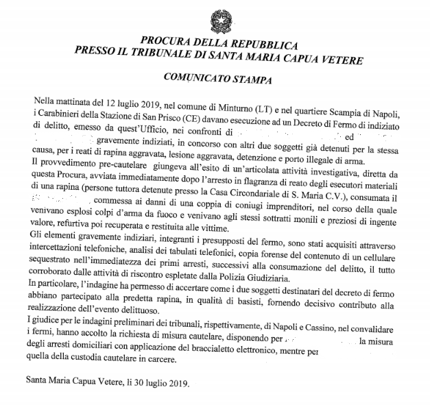 Di seguito, parte del testo del comunicato della Procura della Repubblica, inviatoci dai Carabinieri.