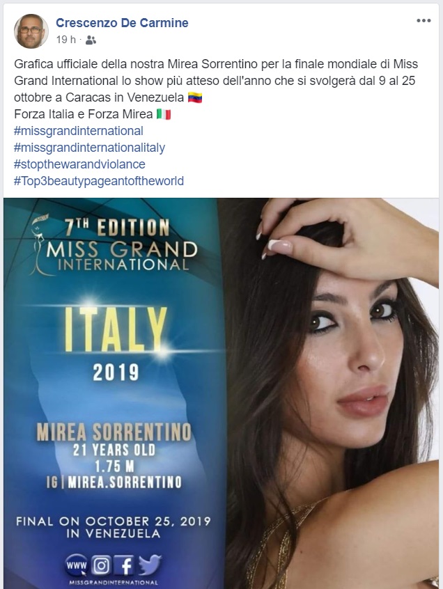 Questo il post pubblicato dal referente campano di Miss Grand International Crescenzo De Carmine. In bocca al lupo alla bellissima Mirea, orgoglio per la città di Pompei.