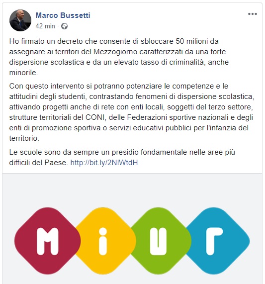 Il Ministro dell'Istruzione Marco Bussetti ha firmato un decreto che sblocca 50 milioni di euro per il Mezzogiorno