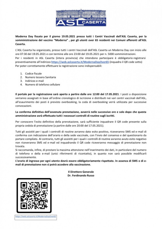Questo quanto apprendiamo dall'ASL Caserta: "MODERNA DAY 19/05/2021 - Come aderire Esteso il termine di adesione alla campagna a tutta la giornata del 18/05 CLICCA QUI"