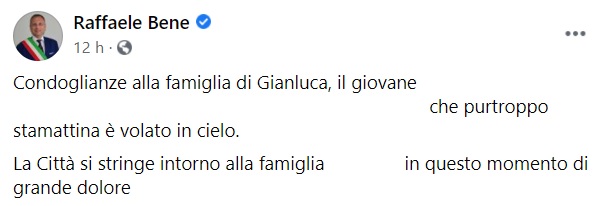 Questo il messaggio di cordoglio che apprendiamo dalla pagina facebook del Sindaco di Casoria: "Condoglianze alla famiglia di Gianluca, il giovane ... che purtroppo stamattina è volato in cielo. La Città - si legge nella nota - si stringe intorno alla famiglia ... in questo momento di grande dolore"