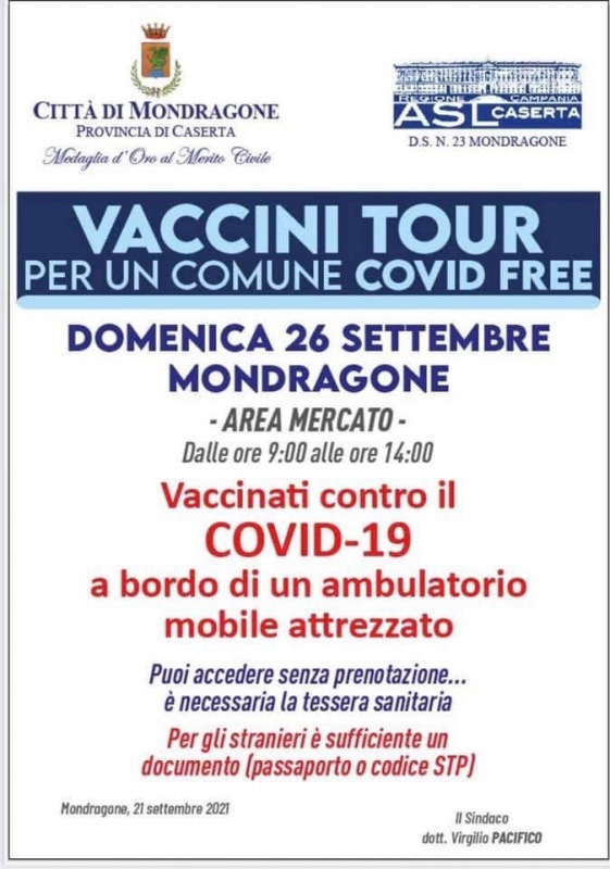 Cambia la location ma non si attenua l'attenzione del Comune di Mondragone sulla campagna vaccinale in favore di tutti i cittadini residenti. Il Sindaco Virgilio Pacifico, dopo il recente successo della tre giorni del tour itinerante in diversi luoghi del territorio comunale del truck sanitario che ha somministrato la prima dose ad oltre 500 residenti, ha seriamente preso a cuore la questione prevenzione COVID-19 - si legge nella nota - ed ha chiesto ed ottenuto dall'Asl Caserta, sempre in collaborazione con il Distretto Sanitario n.23, un nuovo open day dedicato ai vaccini. Per domenica prossima, 26 settembre, il primo cittadino ha programmato la presenza del camper sanitario mobile nell’area mercato domenicale, con il prezioso supporto del nucleo comunale di protezione civile, così da insistere ancora una volta sulla necessità per tutti di immunizzarsi rispetto al Coronavirus. "Abbiamo scelto una location in cui intercettare e convincere a vaccinarsi quei cittadini che ancora non lo hanno fatto. L'unità sanitaria mobile dell'Asl stazionerà nell’area mercato dalle 9 alle 14 - si legge nella nota - per somministrare la prima dose del siero Pfizer a tutti i mondragonesi dai 12 anni in poi che si presenteranno, senza aver bisogno di alcuna prenotazione ma esibendo la sola tessera sanitaria", dichiara il sindaco Pacifico."