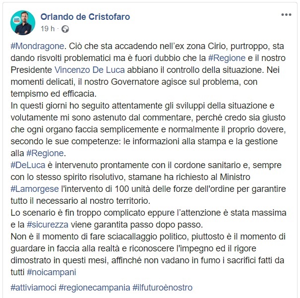 Questo quanto pubblicato dal candidato al Consiglio Regionale 2020 Orlando De Cristofaro