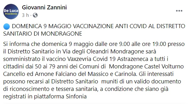 "DOMENICA 9 MAGGIO VACCINAZIONE ANTI COVID AL DISTRETTO SANITARIO DI MONDRAGONE. Si informa che domenica 9 maggio dalle ore 9.00 alle ore 19.00 presso il Distretto Sanitario in Via degli Oleandri Mondragone sarà somministrato- s legge nella nota- il vaccino Vaxzevria Covid 19 Astrazeneca a tutti i cittadini dai 50 ai 79 anni dei Comuni di Mondragone Castel Volturno Cancello ed Arnone Falciano del Massico e Carinola. Gli interessati possono recarsi al Distretto Sanitario muniti di un valido documento di riconoscimento e tessera sanitaria, a condizione- si legge nella nota- che siano già registrati in piattaforma Sinfonia"