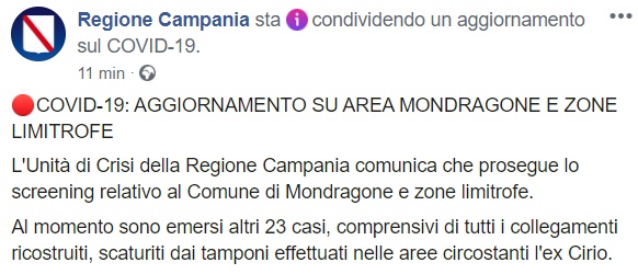 Questo quanto apprendiamo dalla pagina facebook della Regione Campania: