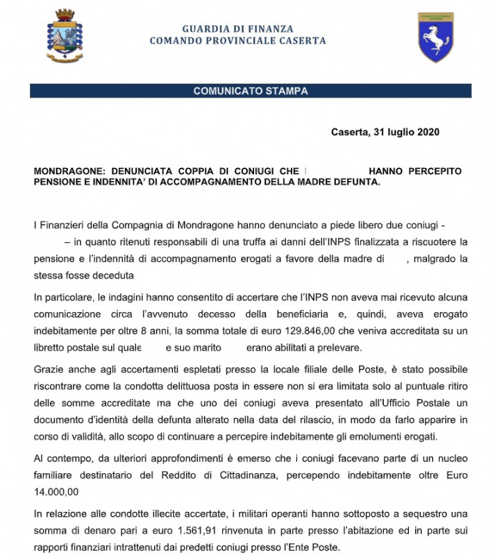 Questa parte della nota stampa della Guardia di Finanza di Caserta: