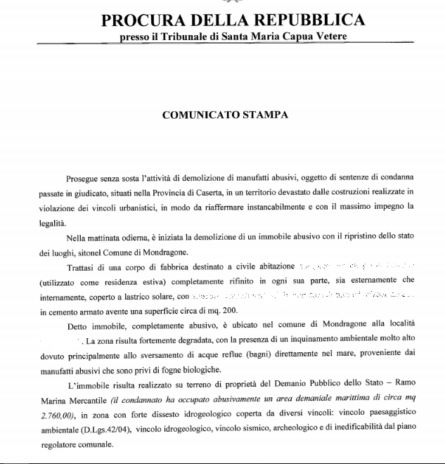 Di seguito, parte del testo del comunicato della Procura della Repubblica presso il Tribunale di Santa Maria Capua Vetere, giunto in redazione.