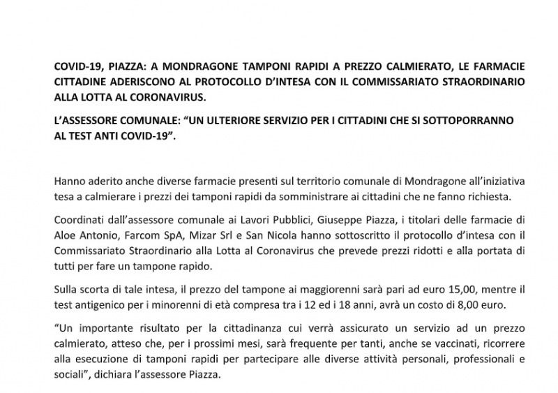 "COVID-19, PIAZZA: A MONDRAGONE TAMPONI RAPIDI A PREZZO CALMIERATO, LE FARMACIE CITTADINE ADERISCONO AL PROTOCOLLO D’INTESA CON IL COMMISSARIATO STRAORDINARIO ALLA LOTTA AL CORONAVIRUS. L’ASSESSORE COMUNALE: “UN ULTERIORE SERVIZIO PER I CITTADINI CHE SI SOTTOPORRANNO AL TEST ANTI COVID-19”. Hanno aderito anche diverse farmacie presenti sul territorio comunale di Mondragone all’iniziativa tesa a calmierare i prezzi dei tamponi rapidi da somministrare ai cittadini che ne fanno richiesta. Coordinati- si legge nella nota- dall’assessore comunale ai Lavori Pubblici, Giuseppe Piazza, i titolari delle farmacie di Aloe Antonio, Farcom SpA, Mizar Srl e San Nicola hanno sottoscritto il protocollo d’intesa con il Commissariato Straordinario alla Lotta al Coronavirus che prevede prezzi ridotti e alla portata di tutti per fare un tampone rapido. Sulla scorta di tale intesa, il prezzo del tampone ai maggiorenni sarà pari ad euro 15,00, mentre il test antigenico per i minorenni di età compresa tra i 12 ed i 18 anni, avrà un costo di 8,00 euro. “Un importante risultato per la cittadinanza cui verrà assicurato- si legge nella nota- un servizio ad un prezzo calmierato, atteso che, per i prossimi mesi, sarà frequente per tanti, anche se vaccinati, ricorrere alla esecuzione di tamponi rapidi per partecipare alle diverse attività personali, professionali e sociali”, dichiara l’assessore Piazza."
