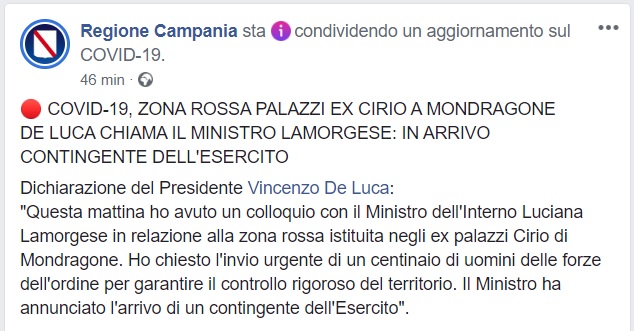 Questo quanto comunicato da Regione Campania