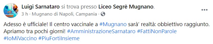 Questo quanto apprendiamo dalla pagina fb del Sindaco di Mugnano: "Adesso è ufficiale! Il centro vaccinale a Mugnano sarà realtà - si legge nella nota -: obbiettivo raggiunto. Apriamo tra pochi giorni!"