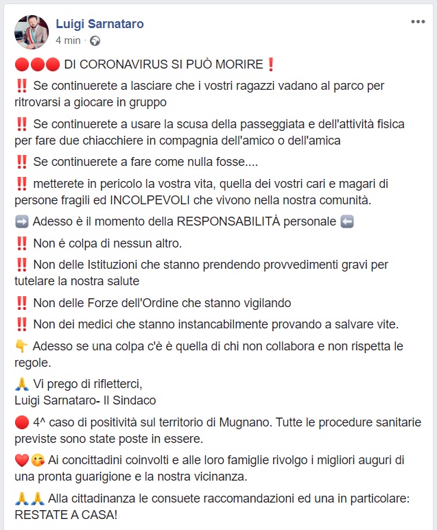 Questo quanto pubblicato dal Sindaco di Mugnano Sarnataro