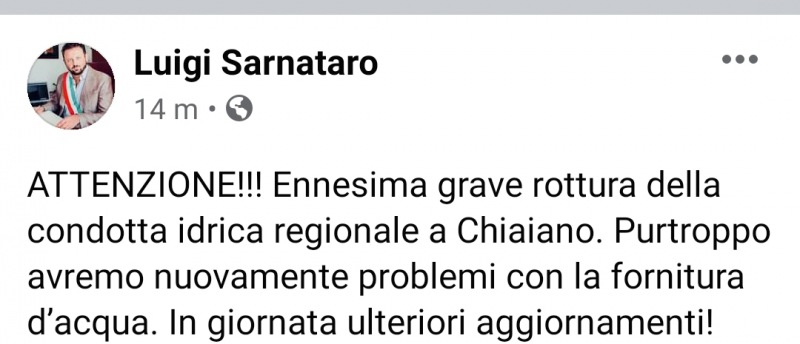 "ATTENZIONE!!! Ennesima grave rottura della condotta idrica regionale a Chiaiano. Purtroppo avremo nuovamente problemi con la fornitura d’acqua. In giornata ulteriori aggiornamenti!"
