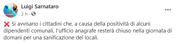 Questo quanto apprendiamo dalla pagina fb del Sindaco di Mugnano di Napoli: "Si avvisano i cittadini che, a causa della positività di alcuni dipendenti comunali, l'ufficio anagrafe - si legge nella nota - resterà chiuso nella giornata di domani per una sanificazione dei locali."