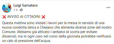 Questo il post pubblicato sulla sua pagina Facebook dal Sindaco di Mugnano Luigi Sarnataro: "Avviso ai cittadini. Questa mattina sono iniziati i lavori - si legge nel post - per la messa in servizio di una nuova condotta idrica a Chiaiano che alimenta diverse zone del nostro Comune. Abbiamo già attivato i serbatoi di scorta per evitare disservizi, ma in ogni caso nel corso della giornata potrebbe verificarsi un calo di pressione dell'acqua".