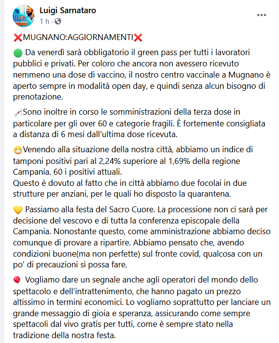 Questo il post pubblicato sulla pagina Facebook del sindaco di Mugnano, Luigi Sarnataro: "Da venerdì sarà obbligatorio il green pass per tutti i lavoratori pubblici e privati. Per coloro che ancora non avessero ricevuto nemmeno una dose di vaccino, il nostro centro vaccinale a Mugnano è aperto sempre in modalità open day, e quindi senza alcun bisogno di prenotazione. Sono inoltre in corso - si legge nel post - le somministrazioni della terza dose in particolare per gli over 60 e categorie fragili. È fortemente consigliata a distanza di 6 mesi dall’ultima dose ricevuta. Venendo alla situazione della nostra città, abbiamo un indice di tamponi positivi pari al 2,24% superiore al 1,69% della regione Campania. 60 i positivi attuali. Questo è dovuto al fatto che - prosegue il post - in città abbiamo due focolai in due strutture per anziani, per le quali ho disposto la quarantena. Passiamo alla festa del Sacro Cuore. La processione non ci sarà - spiega il post - per decisione del vescovo e di tutta la conferenza episcopale della Campania. Nonostante questo, come amministrazione abbiamo deciso comunque di provare a ripartire. Abbiamo pensato che, avendo condizioni buone(ma non perfette) sul fronte covid, qualcosa con un po’ di precauzioni si possa fare. Vogliamo dare un segnale anche agli operatori del mondo dello spettacolo e dell’intrattenimento, che hanno pagato un prezzo altissimo in termini economici. Lo vogliamo - conclude - soprattutto per lanciare un grande messaggio di gioia e speranza, assicurando come sempre spettacoli dal vivo gratis per tutti, come è sempre stato nella tradizione della nostra festa".