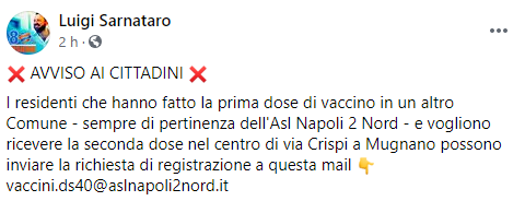Questo il post pubblicato sulla sua pagina Facebook dal Sindaco di Mugnano Luigi Sarnataro: "I residenti che hanno fatto la prima dose di vaccino in un altro Comune - sempre di pertinenza dell'Asl Napoli 2 Nord - e vogliono ricevere - si legge nel post - la seconda dose nel centro di via Crispi a Mugnano possono inviare la richiesta di registrazione a questa mail '[email protected]".