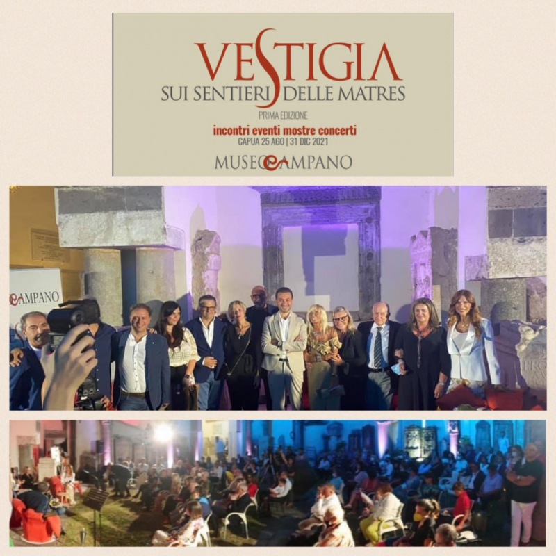 Grandissimo successo di pubblico al Museo Campano ieri sera (25 agosto,ndr) per l’evento inaugurale che ha dato il via a “Vestigia, sui sentieri della Matres” , la rassegna di incontri, eventi, mostre e concerti realizzata dal Cda con il contributo della Regione Campania. Nella meravigliosa cornice del cortile di Palazzo Antignano, sede del Museo, si è registrato il tutto esaurito con presenze importanti e di alto profilo. Dal mondo della cultura alla magistratura, dalle istituzioni civili, militari e religiose ai politici di primo piano, a grandi imprenditori, al mondo delle associazioni, la grande editoria, non è mancato nessuno. Non era mai accaduto nella storia del Museo e dell’intera provincia di Caserta avere un pubblico così! Hanno aperto il convengo con i saluti istituzionali, il sindaco di Capua, Luca Branco, il consigliere provinciale Angelo Campolattano (che ha fatto le veci del presidente Magliocca), e l’assessore regionale Nicola Caputo. Tutti hanno evidenziato come il lavoro del Cda sia stato eccezionale e risolutivo per la rinascita di questo Museo e quando il management è all’altezza i risultati si vedono. Il Cda, infatti, in 6 mesi ha trasformato un Museo latente in un museo pieno di vita, organizzando una rassegna stagionale di primaria importanza. Parterre d’eccezione anche per i relatori: Rosalia Santoro, presidente del Cda del Museo Campano, Paolo Giulierini, presidente/direttore del Mann , Maurizio De Giovanni, scrittore e Antonio Larizza, presidente di Ars Suaviter, con la moderazione di Veronica Maya. Interventi brevi ma di spessore quelli dei relatori che hanno racchiuso l’essenza del tema del rilancio e della rinascita partendo dalla Mater Matuta; si è parlato anche delle donne, della Campania come regione ricchissima di aree e siti culturali e del Museo Campano, che è il più ricco sito, unico in Campania, di “vestigia” dei popoli che hanno vissuto ed attraversato queste terre una volta Campania Felix. Il tutto accompagnato da una scenografia suggestiva di luci e colori, dall’intervento dell’attore Alfonso Grassi e dulcis in fundo dalla bellissima opera realizzata live dall’artista Simona Giglio. Non si era mai visto il Museo Campano così pieno di vita da tanti anni! Ma finalmente è rinato! E questo è solo l’inizio. Vestigia, sui sentieri delle Matres, continua fino a giugno 2022. Ed è solo la prima edizione!"
