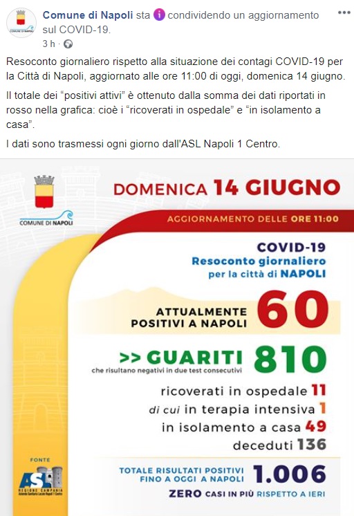 Questo quanto apprendiamo dalla pagina facebook del Comune di Napoli: