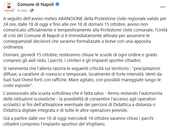 Questo quanto apprendiamo dalla pagina facebook del Comune di Napoli: