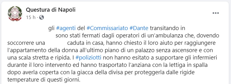 Questo quanto pubblicato sulla pagina fb della Questura di Napoli: " ... Gli agenti del Commissariato Dante transitando in ... sono stati fermati dagli operatori di un’ambulanza che - si legge nella nota -, dovendo soccorrere una ... caduta in casa, hanno chiesto il loro aiuto per raggiungere l’appartamento della donna all’ultimo piano di un palazzo senza ascensore e con una scala stretta e ripida. I poliziotti - si legge nella nota - non hanno esitato a supportare gli infermieri durante il loro intervento ed hanno trasportato l’anziana con la lettiga in spalla dopo averla coperta con la giacca della divisa per proteggerla dalle rigide temperature di questi giorni."